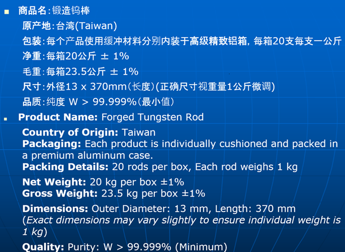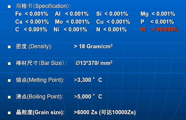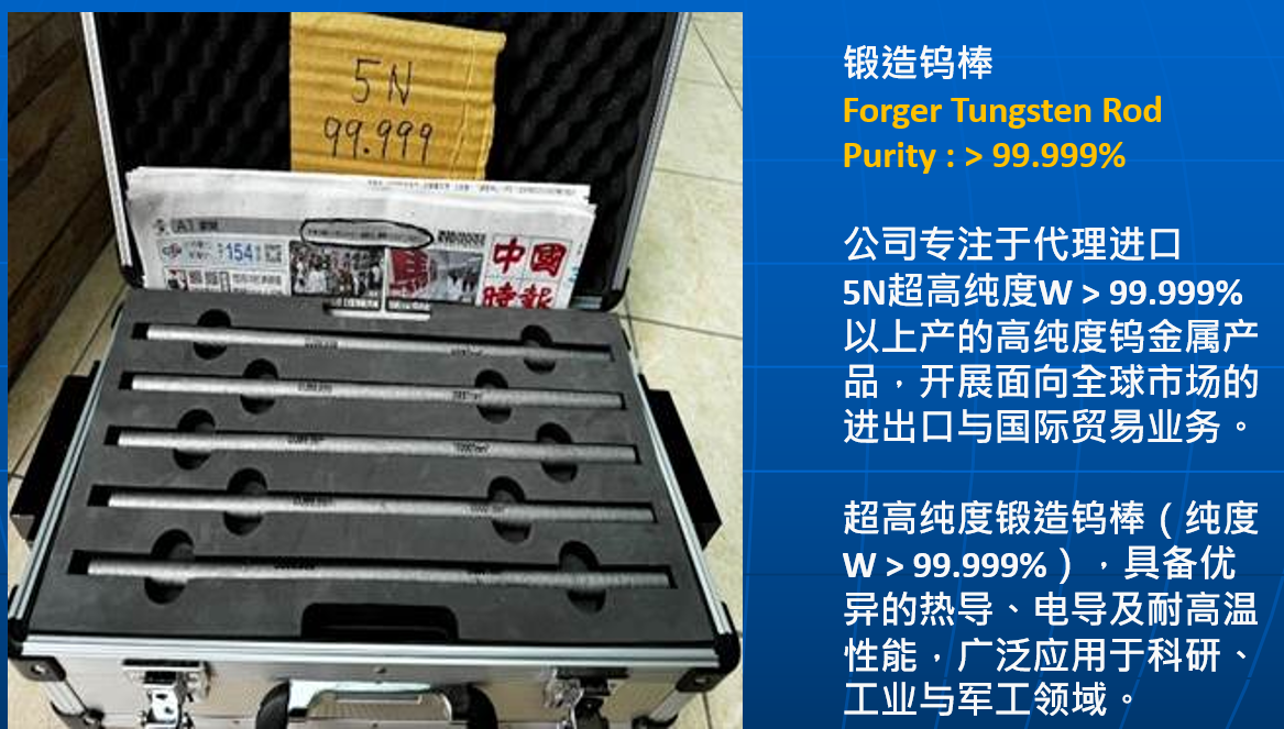 5N ultra-high purity W > 99.999% and above high purity tungsten metal products, carry out import and export and international trade business for the global market 5N超高純度W > 99.999% 以上產的高純度鎢金屬產品,開展面向全球市場的進出口與國際貿易業務。
